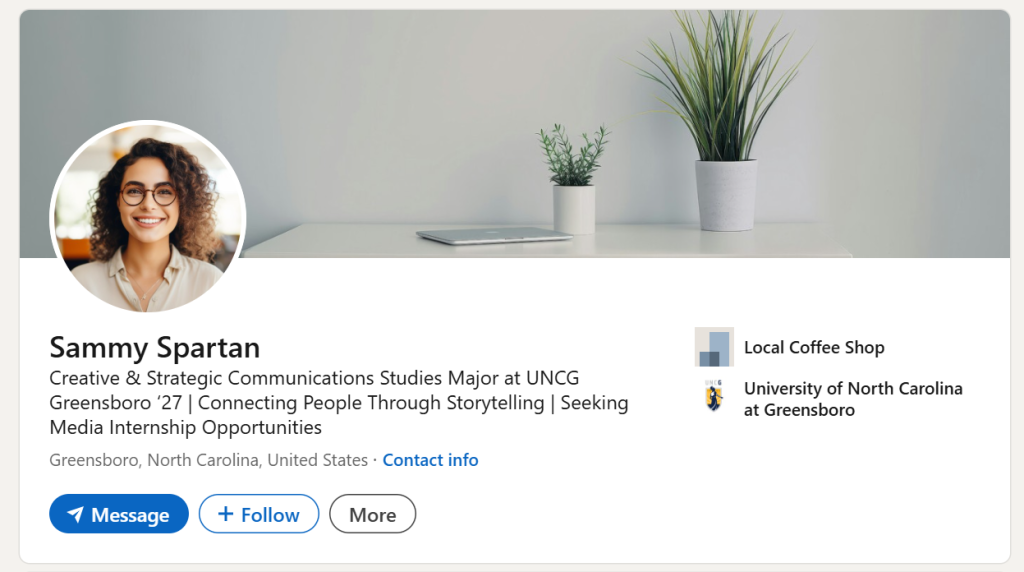 - Headline: Edit your headline to attract readers and show what you’re pursuing. Go beyond “Student at UNCG” by adding your major, skills, and career interests.